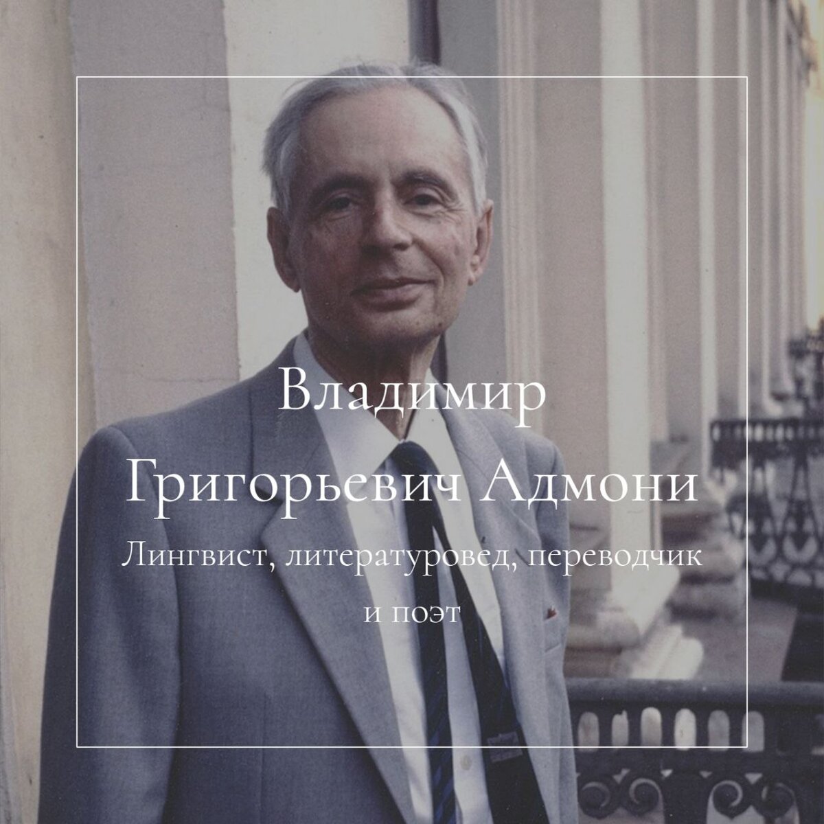Лингвист и литературовед, переводчик и поэт, Владимир Григорьевич Адмони родился в Петербурге в 1909 году в семье историка, публициста и еврейского общественного деятеля Григория Яковлевича Красного-Адмони. Известен и старший брат – Иоганн Адмони – он также оставил след в культурной и образовательной жизни города, был композитором, пианистом и педагогом.