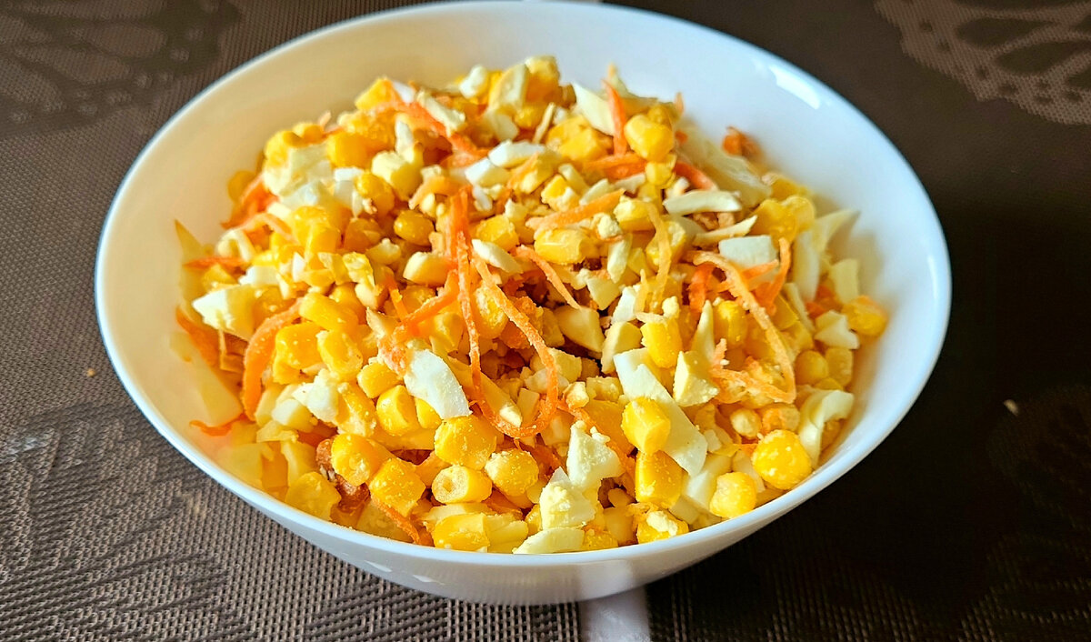 Салат получается сытный и необычный на вкус. Салат с сыром косичка и корейской морковью понравится тем, кто любит яркие по вкусу блюда. Яйца, сочная кукуруза и кавказский сыр немного смягчают остроту корейской моркови. Как сделать салат с сыром косичка и морковью корейской? Очень просто! Для начала подготовьте необходимые ингредиенты по списку. Морковь по-корейски можете взять готовую магазинную или сделать заранее самостоятельно. Овощную часть можете дополнять по своему вкусу. Вместо сыра косички можете взять сулугуни, который нужно натереть на крупной терке или другой сыр по вкусу. Для приготовления нам нужно: Корейская морковка 200-250 гр. Сыр косичка 80-100 гр. Банка кукурузы 1 шт. Яйца 3 шт. Майонез или сметана для заправки салата Соль,перец по вкусу Яйца отвариваем вкрутую, охлаждаем, очищаем и нарезаем небольшими кубиками. Морковь по-корейски выньте из маринада и обсушите. Я слегка отжимала морковь, чтобы салат не получился водянистым. Сырную косичку нарезаем соломкой или на ма