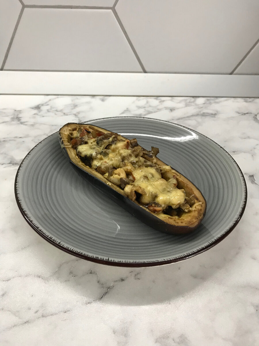 Ингредиенты: Баклажаны разрезаем пополам Аккуратно вынимаем сердцевину, формируя лодочки. Обжариваем на сковородке грудку, грибы, помидор и сердцевину баклажана на небольшом количестве оливкового масла. Получившейся начинкой фаршируем наши лодочки. Посыпаем сыром и отправляем в духовку, разогретую до 180 градусов, на 15 минут. Форму для выпекания смазывать не нужно. Наше блюдо готово. Приятного аппетита !🧑🍳