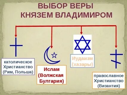 Как многим наверное известно, Князь Владимир в 988 году крестил Русь. И с тех пор Россия стала православной страной. Но почему же именно христианскую православную церковь выбрал Владимир, ведь на тот период существовало множество конфессий. В данной статье я хочу вам рассказать легенду о выборе религии. Никто точно не знает было оно так или это просто вымысел, но все же прислушаться стоит,так как в ней есть определенный смысл и концепция. Легенда Когда князь Владимир пришел к решению, что для объединения народа нужна общая вера, он решил позвать к себе представителей разных религий. И вот приходили к нему представители различных верований и каждый рассказывал о своей. Ислам Пришли к князю сперва соседи из Волжской Булгарии и проповедовали ему ислам.Владимир их внимательно выслушал, и отверг их религию, так как мусульманам надо было отказаться от от свинины и алкоголя. Последнее больше всего не устроило князя Киевского. Католицизм Затем пришли к князю западные христиане из Рима и