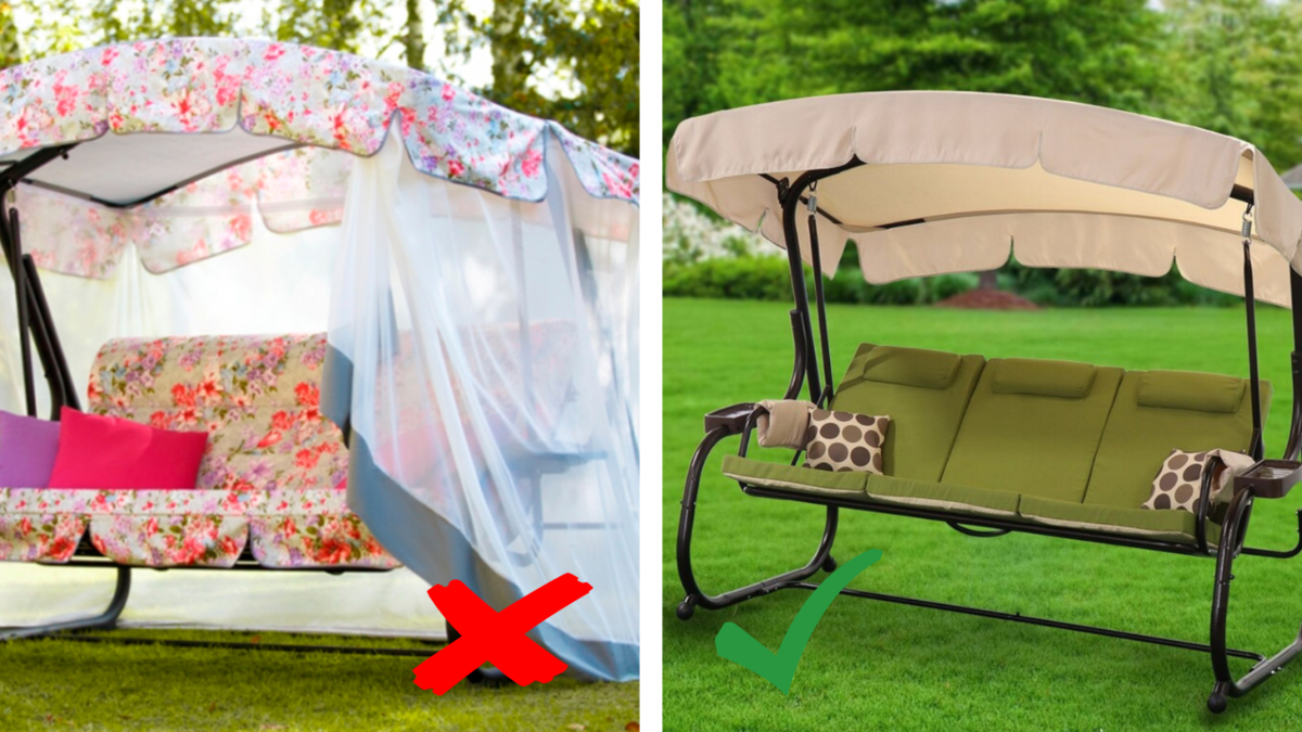 Рассказываем, какая мебель устарела и что взять ей взамен. Садовые качели с несуразным узором Если дача – это место для отдыха, то в ней точно нет места никаким раздражающим вырвиглазным рисункам. Чтобы в свой выходной спокойно отдохнуть и не о чем не думая качаться на качелях, откажитесь от пестрых неоновых узоров. Качели могут выглядеть уютно и современно, если заменить аляпистые завитушки на однотонный текстиль. Кстати, стоят такие модели ничуть не дороже. Какие садовые качели выбрать на замену? Шезлонг из пластика Такие напоминают среднестатистический отель. Но мы же с вами хотим оформить комфортный дачный участок. Тогда откажемся от посредственности и выберем шезлонг из натурального дерева или искусственного ротанга. Стоят такие дороже пластиковых. Но и прослужат они намного дольше. Какой шезлонг выбрать на замену? Пластиковые стулья Такие точно не украсят ни один дачный участок. Стильная и комфортная альтернатива – плетеные стулья, которые великолепно сочетаются с атмосферой прир
