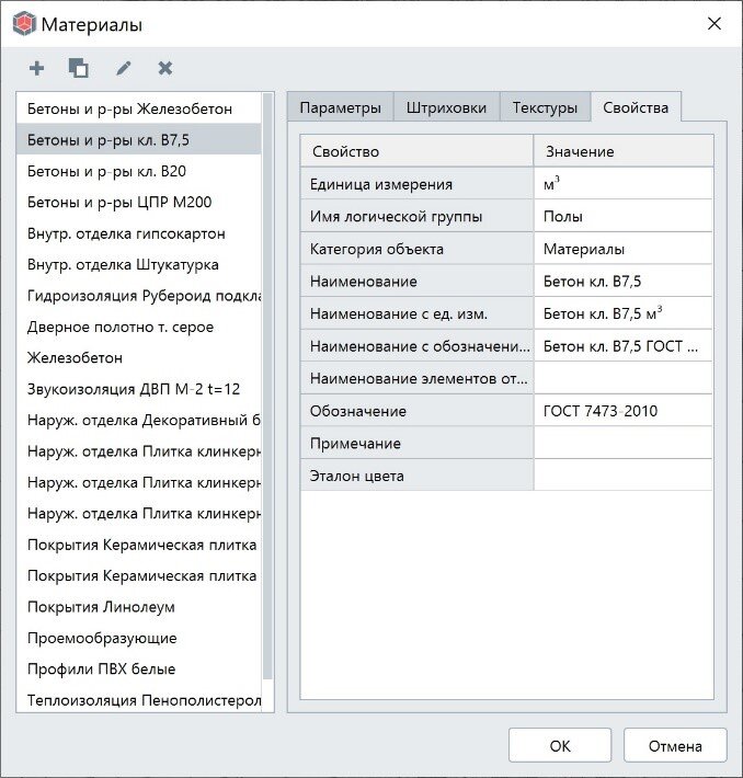 Проектировщик может подготовить и настроить свойства материала бетона или железобетона в соответствии с информацией, которую в процессе оформлении следует отобразить на чертежах.