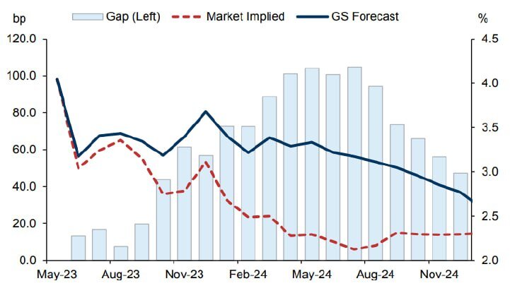 Этот прогноз от GS, означает что ФРС либо будет держать ставку высокой весь этот и следующий год, во что