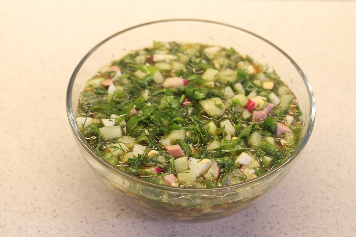 Итак, яйца и картошку варят, охлаждают и нарезают мелким кубиком. Огурцы моют. Если у них жесткая или горькая шкурка, ее следует очистить, а сам овощ тоже нашинковать и добавить к яйцам с картошкой. Теперь наступает черед колбасы. Лучше всего для окрошки подходя
