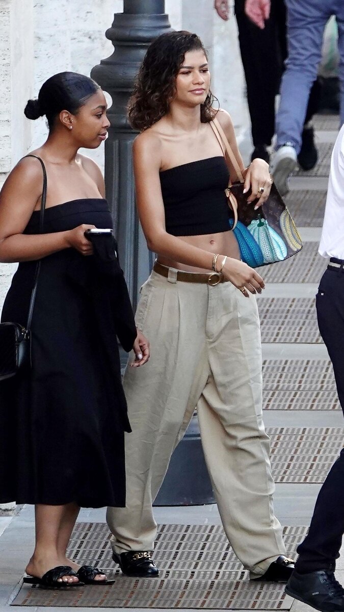 Ковровая дорожка это или прогулка с подругой — Зендея всегда выглядит превосходно. Так, недавно она отправилась в римский ресторан в стильном летнем аутфите, надев топ-бандо и широкие льняные брюки на низкой посадке, которые дополнила кожаным ремнем. К образу звезда подобрала лакированные лоферы, принтованную сумкую Louis Vuitton и крупные украшения: перстни и жесткие браслеты. Однако модный повседневный лук не позволил Зендее попасть в ресторан — он не соответствовал дресс-коду. Читайте также на нашем сайте: Подписывайтесь на нас в Телеграме, чтобы быть в курсе последних новостей!