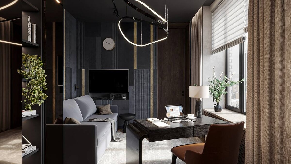 Рабочий кабинет в квартире уже не редкость. Все чаще владельцам хочется иметь отдельное пространство, где можно спокойно решать текущие задачи, даже если вы не на удаленной работе. В проектах дизайн бюро Art Concept рабочие кабинеты максимально функциональны, и могут использоваться даже как гостевая комната, в случае необходимости. В интерьере кабинета мы продумываем каждую деталь, чтобы пространство было комфортным, и очень часто наши предложения утверждаются с первого раза. Кабинет владельца квартиры в стиле минимализм – воплощение функциональности небольшого пространства и красивого дизайна. Насыщенные и сочные темные оттенки отделки из натуральных материалов подчеркивают изысканность интерьера. На небольшой площади мы гармонично расположили рабочее место, раскладной диван, скрытый в нише телевизор, над которым разместилась небольшая полочка для размещения оборудования, стеллаж с раздвижным фасадом. На случай если хозяин квартиры будет ночевать в кабинете (например, перед ранней вст