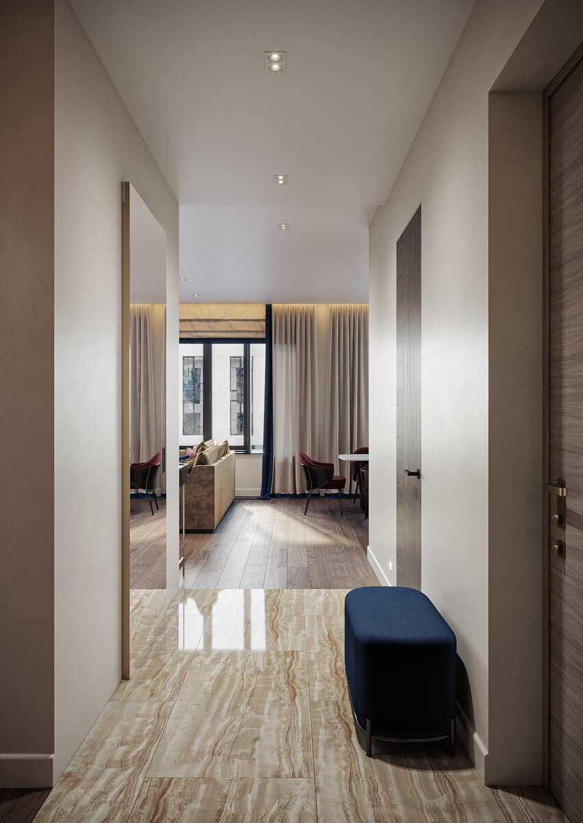 Пожеланиями наших клиентов было найти просторную квартиру, где у каждого из членов семьи будет своя зона: отдельный блок для родителей плюс рабочий кабинет для хозяина, детские комнаты со своим санузлом и системами хранения, общая зона кухни и гостиной, гардеробная комната и гостевой санузел. Такая квартира была найдена, но мы внесли определенные изменения в план застройщика. Изначально, по плану БТИ, кухня должна была быть в дальней части квартиры. Это не самый удобный вариант, так как она находилась бы далеко от входа и каждый раз приходилось бы нести продукта вглубь квартиры, а входная зона была бы темной и без естественного света. Алена Чмелева предложила перенести кухню и гостиную ближе ко входу, что позволило создать и светлую входную зону и дополнительный комфорт. В прихожей расположился гостевой санузел, который мы разделили стеклянной перегородкой, за которой организовали зону постирочной. Также на входе есть гардеробная комната с пятью секциями, отдельная - для каждого члена