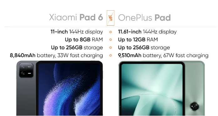 OnePlus Pad обладает большей по ёмкости батареей с более быстрой проводной зарядкой и немного более оптимизированной селфи-камерой. Xiaomi Pad 6 имеет более привлекательную стоимость. Он стоит значительно дешевле своего оппонента, хотя и допускает некоторое незначительное снижение цифровых показателей характеристик. Если стоит задача приобрести планшет для потоковой передачи контента, обычных игр, чтения электронных книг и других повседневных занятий, Xiaomi Pad 6, безусловно, является более рациональным выбором. Хотя, если требуется более длительное время автономной работы, то стоит обратить внимание на OnePlus Pad.