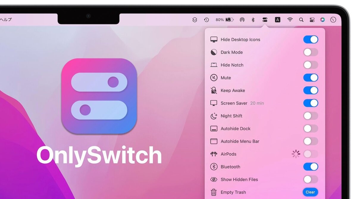 Приложение OnlySwitch для Mac, которое является полностью бесплатным, ставит перед собой цель сохранить подборку наиболее часто используемых действий, то и дело выполняющихся в повседневной компьютерной жизни, прямо в строке меню Mac, чтобы иметь возможность добраться до них в любое время. Среди них такие простые действия, как временное скрытие иконок рабочего стола, подключение AirPods и запуск общесистемного тёмного режима, а также более сложные действия, такие как запуск онлайн-радиостанции, активация таймера Pomodoro, отключение микрофона или отображение панели путей в Finder – и всё это одним кликом мыши или с помощью сочетания клавиш. Недавно приложение расширило набор функций, включив в него специальные дополнительные возможности, такие как способность скрывать выбранные значки других приложений в строке меню и тем самым вносить немного больше наглядности в строку меню Mac. Теперь, впервые, приложение экспериментирует с интеграцией отдельных быстрых действий. Новая функция «Эвол