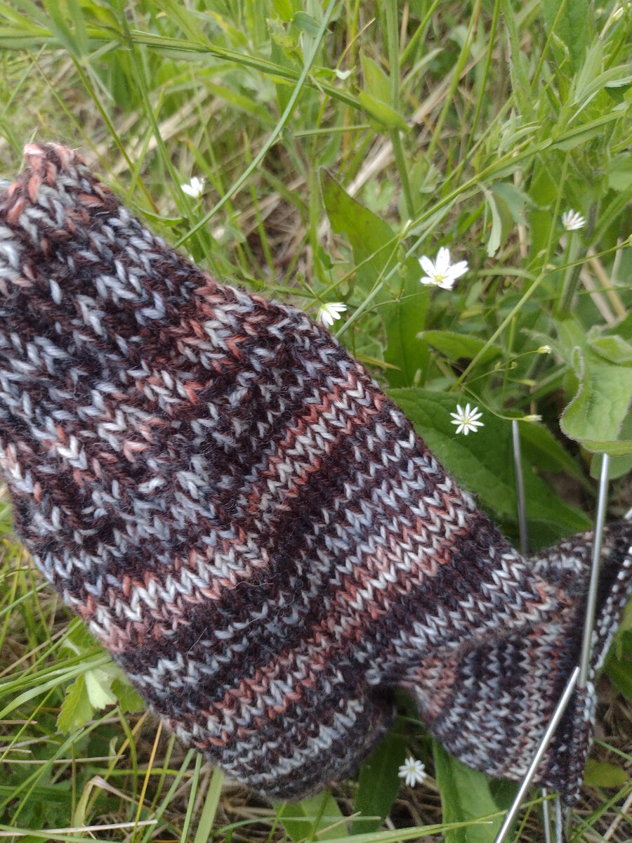 Всех приветствую! Я продолжаю вязать мужские носки, этот месяц, к сожалению, не такой плодотворный, как предыдущий. У меня в работе третья пара, в этот раз миксую Супервош Артисан и Ланаголд 800. Результат мне нравится. Ланаголд 800 немного добавляет плотности Артисану. В этот раз носочки в шоколадной гамме. Так как времени катастрофически не хватает, вяжу и на прогулке и в дороге. Пока такие мои результаты. У нас очень похолодало, днём еле дотягивает до +12. Завтра планирую шить. А над чем вы работаете?