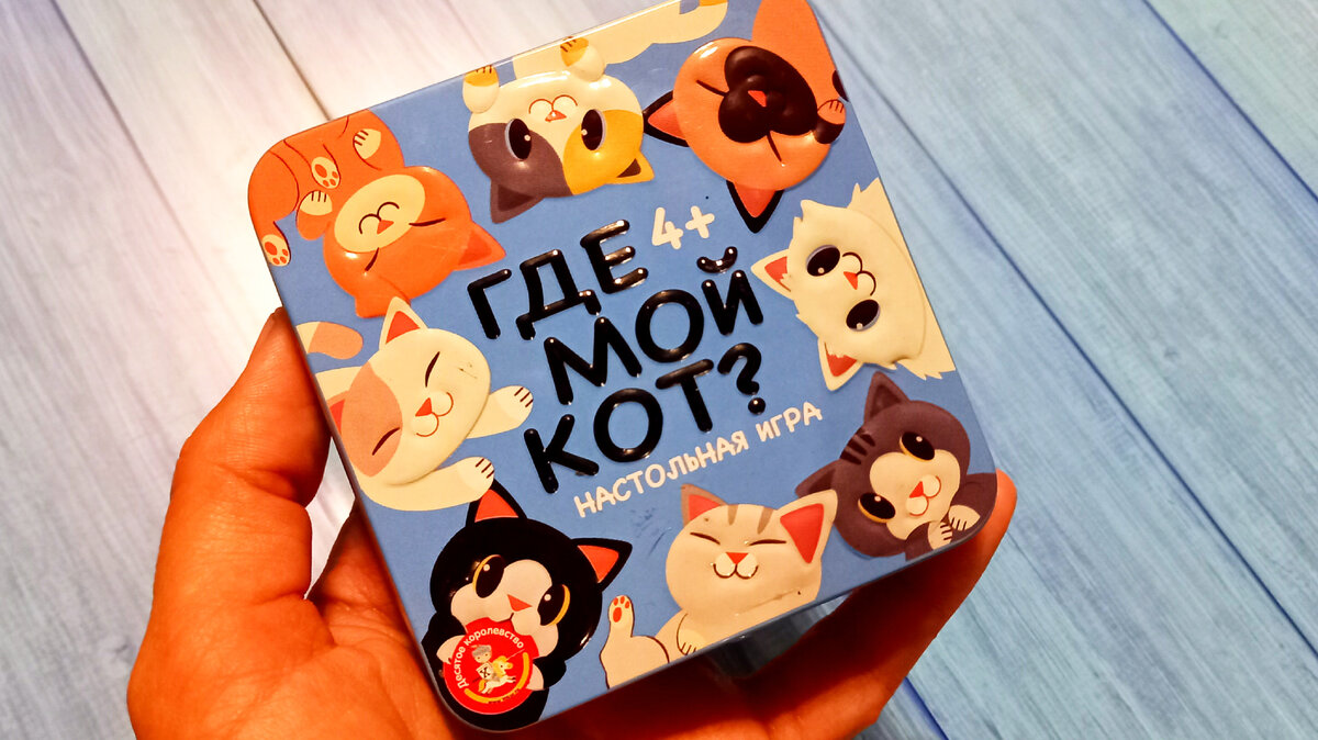 Настольная игра "Где мой кот?", которая помещается в ладошку, — отличная вещь, чтоб взять с собой в путешествие! Она лёгкая, компактная, недорогая и интересная! Правда, для автомобиля или самолёта не подойдёт, а вот для поезда в самый раз — в разложенном виде карты займут как раз ширину спального места или стол. А ещё эту игру оценят любители котиков! Ведь тут каких только нет: белые, серые, рыжие, в полоску, в крапинку, в "ляпинку", однотонные, кричащие, спящие, игривые, серьёзные. Игра весёлая и энергичная. Направлена на развитие внимания. Бросаете кубики и по скорости должны найти подходящего котёнка. Надо совместить сразу три условия, изображённых на кубиках: окрас, позу, рисунок. Это не так-то легко! Играть можно в трёх вариантах, начиная с самого лёгкого, для малышей от четырёх лет. Упакована игра в милейшую жестяную коробочку. Карты напечатаны на крепком картоне. Кубики довольно большого размера, пластиковые. Выпускает эту ми-ми-мишную прелесть "Десятое королевство". У них це