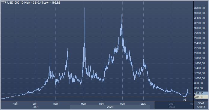 График цены ближайшего фьючерса на спотовый индекс газа TTF на бирже ICE Futures (в долларах США за тысячу кубометров) интервалами в 1 день