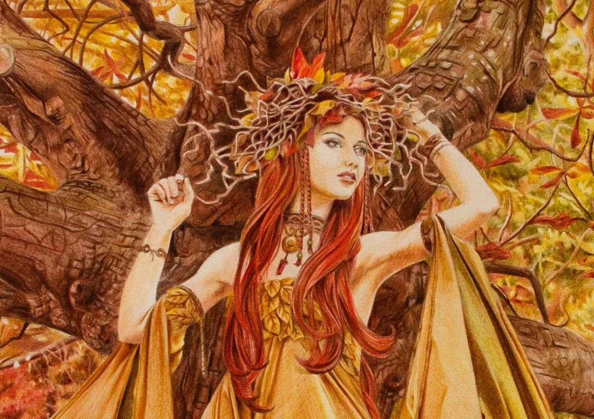 Вот Осень к дому подошла с последними цветами, Она стучит в мое окно: "Пусти меня, прошу!". Стоит и смотрит на меня янтарными глазами: "Скорее двери мне открой, тебя я не стесню". Я открываю. Вот она. Вся в золоте. Блистая, Заходит плавно и кладет мне руку на плечо. "Ты здесь одна?" - спросила вдруг. "Одна" - я отвечаю. Она, улыбкою блеснув, сказала "Ничего. Поверь, я тоже ведь одна. Дождливою порою Мне очень грустно. И в тоске брожу я в тишине. И знаешь, ты могла бы быть сестрой моей родною. Меня пойми ты и прими. Нужна ты очень мне!". Теперь мы с Осенью вдвоем скользим легко, неслышно, На мне расшитый золотом багряный сарафан. Монисто из рябины и венок из листьев рыжих, А вечером я кутаюсь в белеющий туман. Душа моя, как лес ярка, в глазах огонь сияет И день и ночь я по земле без устали иду. Всегда смеюсь и радуюсь я, но никто не знает, Что загрустив, я горькие дожди на землю лью.