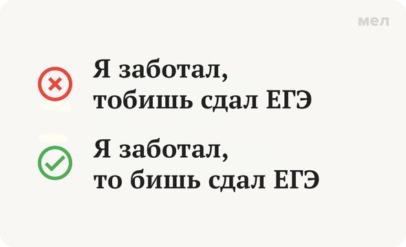 Словосочетание «то бишь» образовано из двух слов. С частицей «то» все вроде бы понятно. А вот что такое «бишь»? Разбираемся, а заодно вспоминаем правильное написание союза. Правильно: то бишь Устойчивое сочетание «то бишь» в словарях сопровождается пометкой «устаревшее», однако в бытовой речи его все еще можно встретить. В книжных текстах эта форма тоже используется, но только в качестве приема, подчеркивающего разговорность речи. Значение у сочетания аналогично значению союза «то есть». На письме оно обособляется запятой. Теперь о написании. В предложении сочетание «то бишь», как и «то есть», выступает в роли пояснительного просторечного союза. Образовано оно при помощи двух слов — частицы «то» и еще одной частицы «бишь» (когда-то она образовалась от глагола «баешь» — «говоришь»). А две частицы между собой не сращиваются, то бишь пишутся раздельно. Ещё больше весёлых и полезных карточек о русском языке — в «Грамотности» на «Меле» во «ВКонтакте». Подписывайтесь, чтобы всегда говорить