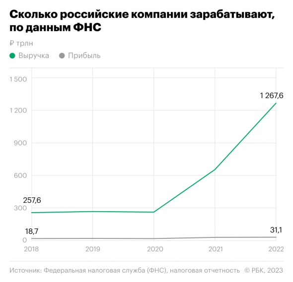 Но несмотря на двукратный рост выручки, прибыль компаний увеличилась только на 5,9%. С 29,4 трлн рублей до 31,1 трлн рублей, следует из статистики Федеральной налоговой службы (ФНС). При средней в 2022 году инфляции на уровне 13,8% в реальном выражении прибыль фактически снизилась, пишет РБК. Эксперты утверждают, что расхождение выручки и прибыли связано с возросшими издержками из-за санкционного давления. В 2018-2020 годах выручках компаний находилась на уровне 260 трлн рублей. Показатель начал резко расти с 2021 года, когда по итогам выручка увеличилась до 655 трлн рублей. В 2022-м доходы превысили 1 квадриллион рублей всего за девять месяцев. В материалах ФНС говорится, что рост выручки обусловлен «ростом экспортной выручки организаций в основном в нефтегазовой отрасли экономики, а также восстановлением потребительского спроса на товары, работы и услуги». Вместе с тем за 2022 год выросли и налогооблагаемые доходы россиян — +19%, то есть до 41,4 трлн руб. ФНС объясняет это ростом зар