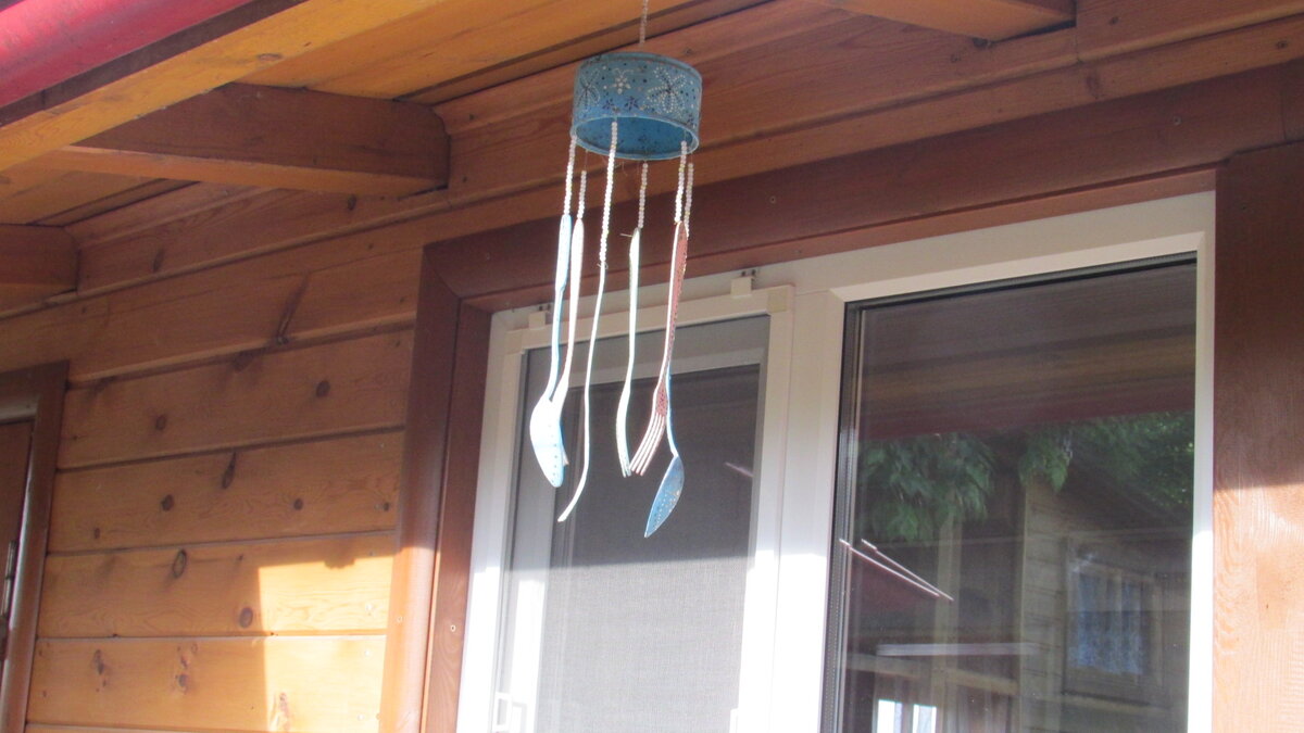 Основой в нем является консервная банка, к которой привязаны старинные алюминиевые ложки и вилки.