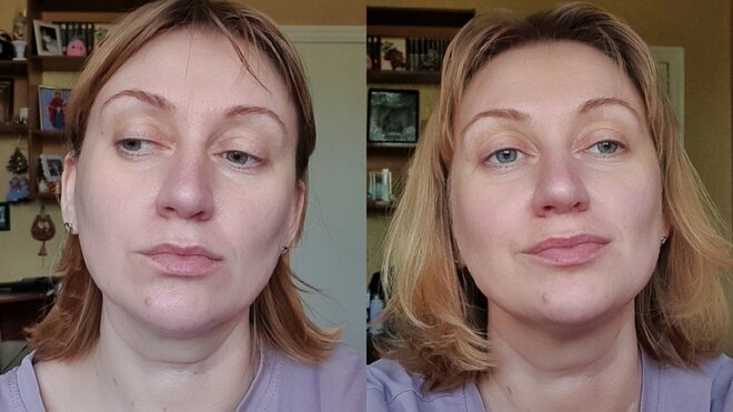 Кстати, если сверху нанести более светлую тональную основу, то лицо моментально становится светлее.