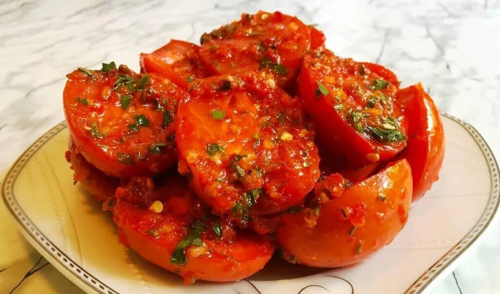 Таких вкусных помидоров вы еще не пробовали, можете мне поверить. Съедаются моментально сами по себе, а уж если в прикуску к шашлычку, то получается очень аппетитно.