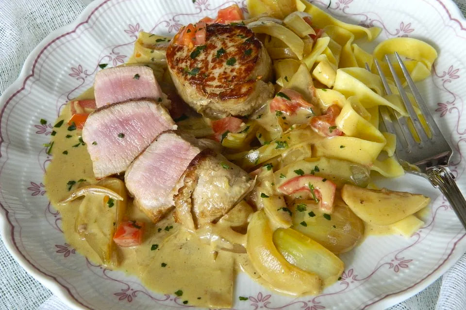 Название рецепта звучит как название ресторанного блюда, причем очень сложного. А на самом деле ничего сложного в нем нет. Разве что чистка и нарезка лука, честное слово! Потому дольше нахваливать не буду, а перейду сразу к делу: Берем: Как готовим: Вырезку нарезаем на медальоны толщиной 2-3 см. Обмываем, осушаем, солим, перчим и отправляем на сковороду с разогретым маслом. Обжариваем на сильном нагреве по 2-3 минуты с каждой стороны, до появления румяной корочки. Достаем мясо и на его место отправляем нарезанный четверть кольцами репчатый лук. Жарим до румяности, в самом конце присыпав мукой и карри. Хорошо перемешиваем и, когда он окончательно карамелизуется, деглазируем водой, а потом сдабриваем сливками, после чего прогреваем минуту-две. Томат моем, нарезаем на кубики, петрушку рубим. Теперь либо отправляем мясо в форму для запекания, присыпав сверху петрушкой и помидором и полив соусом, либо просто выкладываем мясо в сковороду к соусу, а сверху – петрушку и помидор. И ставим в д