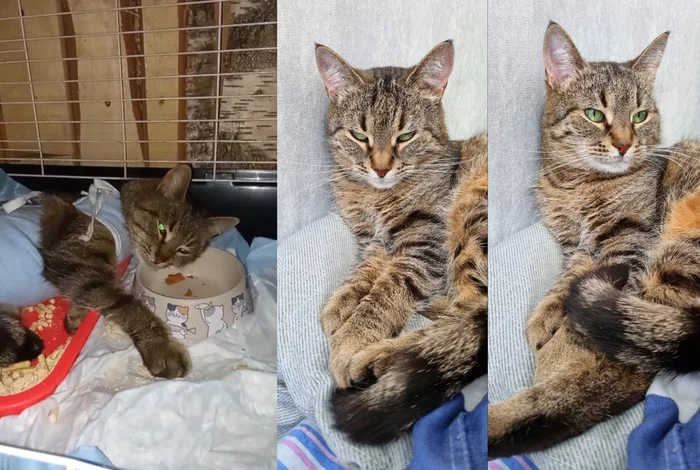 Эту кису мне отдали на стерилизацию - кто-то оставил ее в подъезде города, рядом с которым мое СНТ. Но так как я принимаю заявки на льготную и бесплатную стерилизацию, я приехала за ней, чтобы отвезти ее в клинику (у заявителя не было машины). Привезла кошку и поставила в клинике. Через некоторое время мне позвонил врач и сказал, что кошка, скорее всего, беременна и стоимость будет выше, а после во время операции оказалось, что это пиометра закрытого типа и через день кошка бы погибла. Шансы после операции были 50/50, но Плюша оказалась сильной кошкой. Спасибо большое врачу Косте опять за его золотые руки.