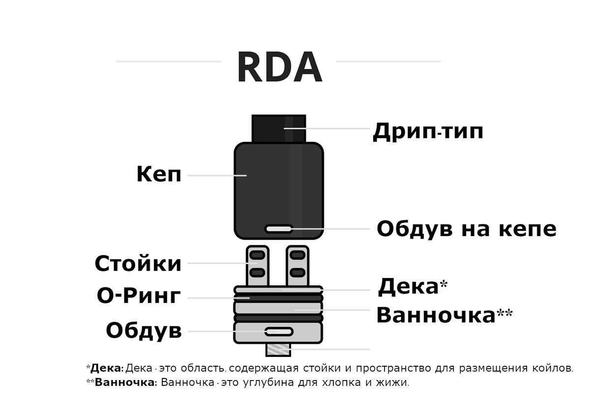 Атом или атомайзер одна из главных частей электронной сигареты, с помощью которой жидкость для курения преобразуется в пар. Тушка или мод — устройство на которое накручивается атомайзер. Сегодня будет разговор именно об атомах. У всех атомах есть одно это: 510 резьба(у мода принимающая 510) а также койл (от англ. coil – катушка, спираль) – часть устройства, которую также часто называют, просто «испаритель», «испарик», «катушка», «намотка», или как-нибудь ещё. Первый и самый простой это дрипка или RDA (rebuildable dripping atomiser), представляет собой обслуживаемый атомайзер дрипка. С этим типом атомайзера вы капаете жидкость для электронных сигарет прямо на ватку — резервуара для хранения жидкости представляет из собой маленькую ванночку. Дрипка обычно состоит из деки, стоек, кепа, дрип-типа (типка) Дека вкручивается в мод, в нее вкручиваются стойки, в них вкручиваются койлы, в них пихается ватка и все! Второй чуть более сложный это RTA (Rebuildable Tank Atomizer) Представляет собой о