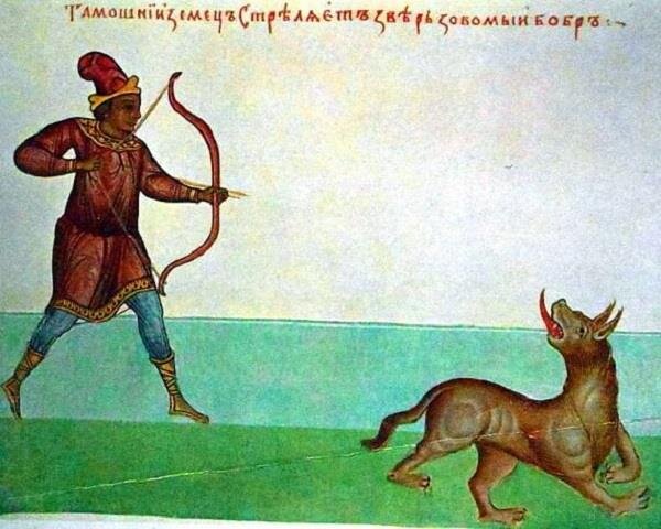 Бабра, он же тигр, на Руси отродясь никто не знал – у нас, чай, не Индия какая. Лиса, медведь или заяц какой – это пожалуйста, а вот бабр – извини, брат. Не ведаем. Приведу один пример. Существует очень популярная в Средние века книга «Христианская топография», которую написал еще в шестом веке – шестом, не шестнадцатом! – византийский купец Козьма Индикоплов, то есть «Козьма, плававший в Индию». Сами понимаете, Индия в этом сочинении поминается достаточно часто – к примеру, автор рассказывает об охоте на тигров. А теперь посмотрите, как фразу из книги «Тамошний земец стреляет зверь зовомый бабр» проиллюстрировали древнерусские художники XVII века. Которые, сами понимаете, тигра в глаза не видели. Зато с фантазией у них, как и у всех художников, было хорошо. Каких же тигров они придумали? Вариант № 1. Бобик Вариант №2. Рептилоид И вариант № 3, мой любимый - "Когтистый конь". Обожаю. Больно уж неподдельное изумление написано на лице и у охотника, и у «тигра». И – заметьте - все трое ба