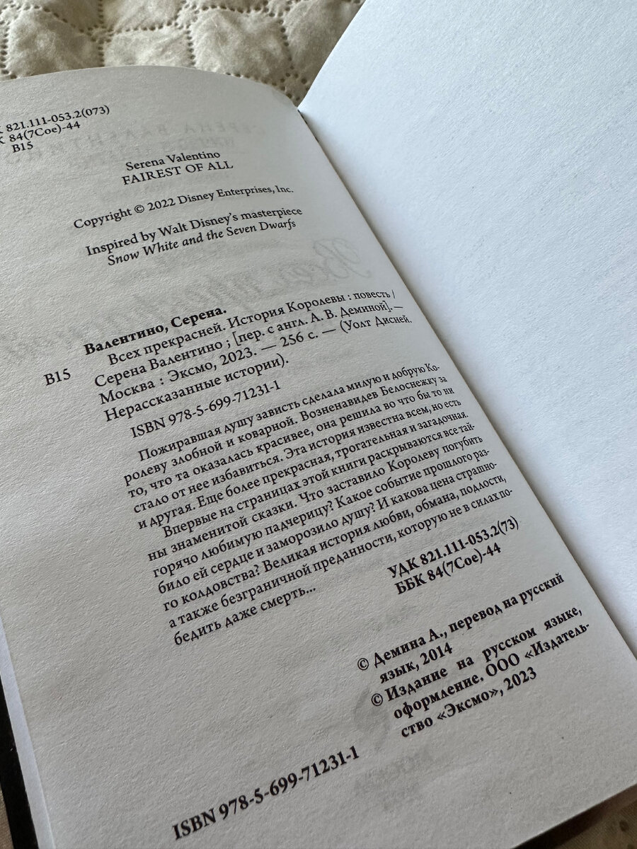 Она является первой в серии "Злодеи Дисней. Нерассказанные истории" , автора Серены Валентино. Фигура Злой Королевы вообще меня никогда не интересовала, ну свернувшаяся на своей красоте дамочка - ОК!) Я даже не могу вспомнить, что про нее было рассказано в самой Диснеевской сказке " Белоснежка", по отзывам , в книгах все известные из мультиков факты учтены. Читается легко, но мне было немного приторно и скучно , особенно в самом начале, где все невозможно хоРРррошие. Концовка была неожиданной, хотя именно она казалась слишком уж предсказуемой. Сдается мне , что книги рассчитаны на более молодую аудиторию. Будучи девочкой 32 лет я считаю, что можно было добавить больше драмы в описании жизни королевы, так как судьба у неё - капец! Если автор делает упор на тяжелое детство и боль от потерь (поверхностно, явно можно рекомендовать к просмотру "Мужское и женское" как образец историй с более глубоким сюжетом ) , то мне кажется , что история брака с папой Белоснежки ещё более трагична и п