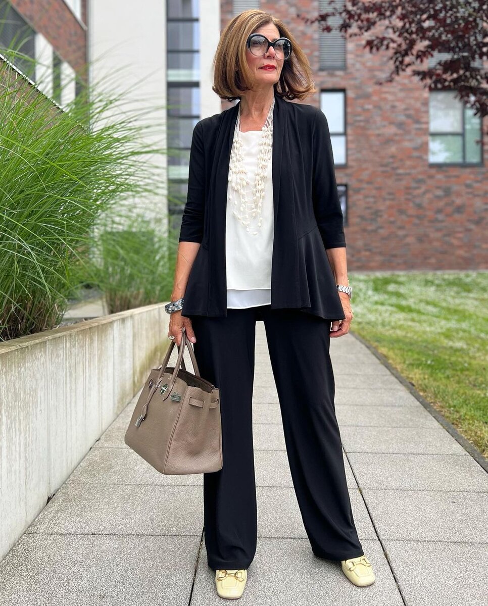- Летний брючный костюм из лёгкой пластичной ткани, образующей мягкие складки. Костюм состоит из прямых брюк и легкого жакета без подкладки. Жакет с подрезами на боках с расклешенными вставками. К костюму добавлен белый двухслойный топ из легкой ткани, а также комфортную обувь и стильным украшением на шею.