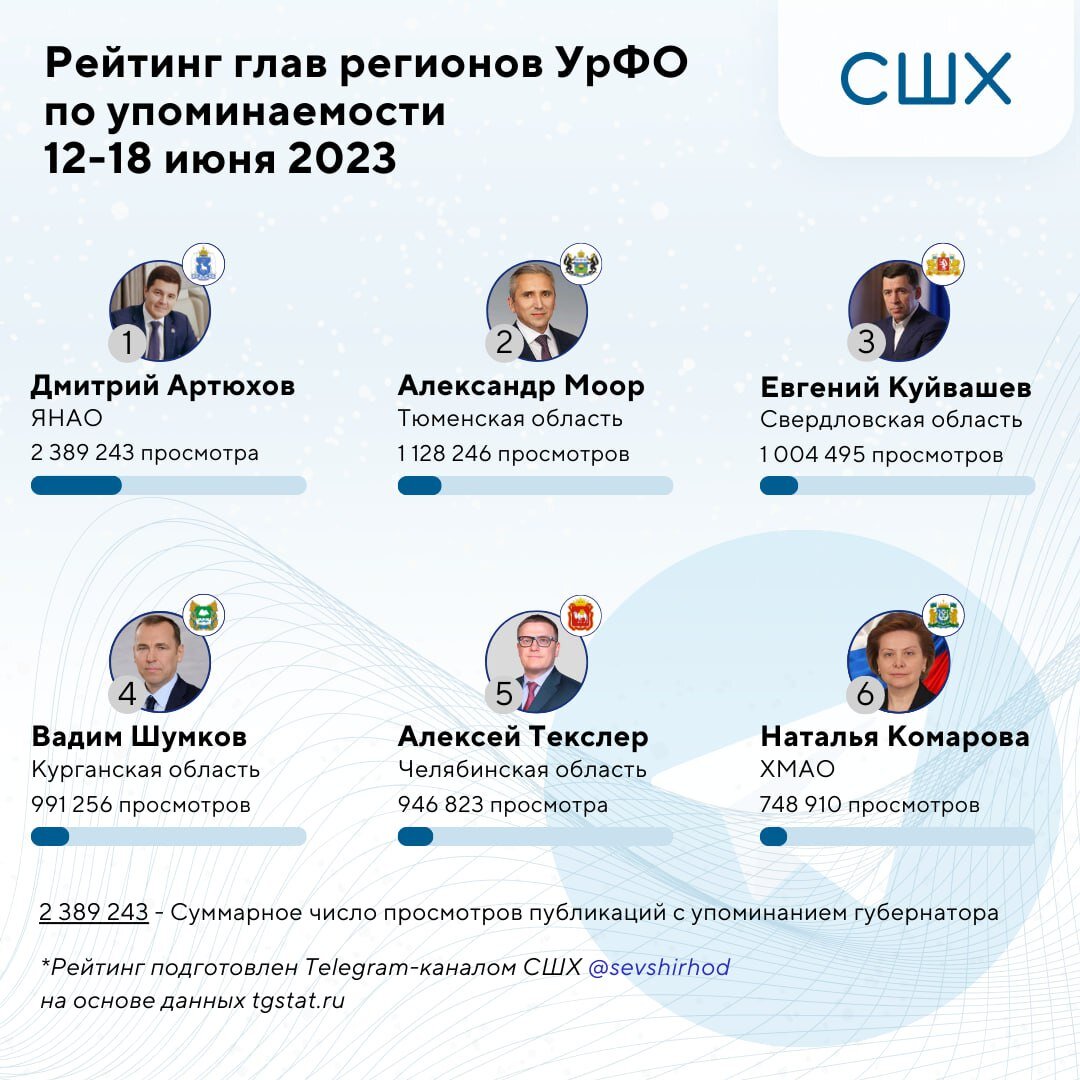 Подводим итоги прошлой недели по охвату в Telegram для губернаторов УрФО — лидирует в рейтинге губернатор ЯНАО Дмитрий Артюхов. С 12 по 18 июня с упоминанием главы Ямала опубликовано 802 поста, которые набрали 2 389 243 просмотров. Читателей продолжает интересовать рабочий визит Артюхова в ДНР.