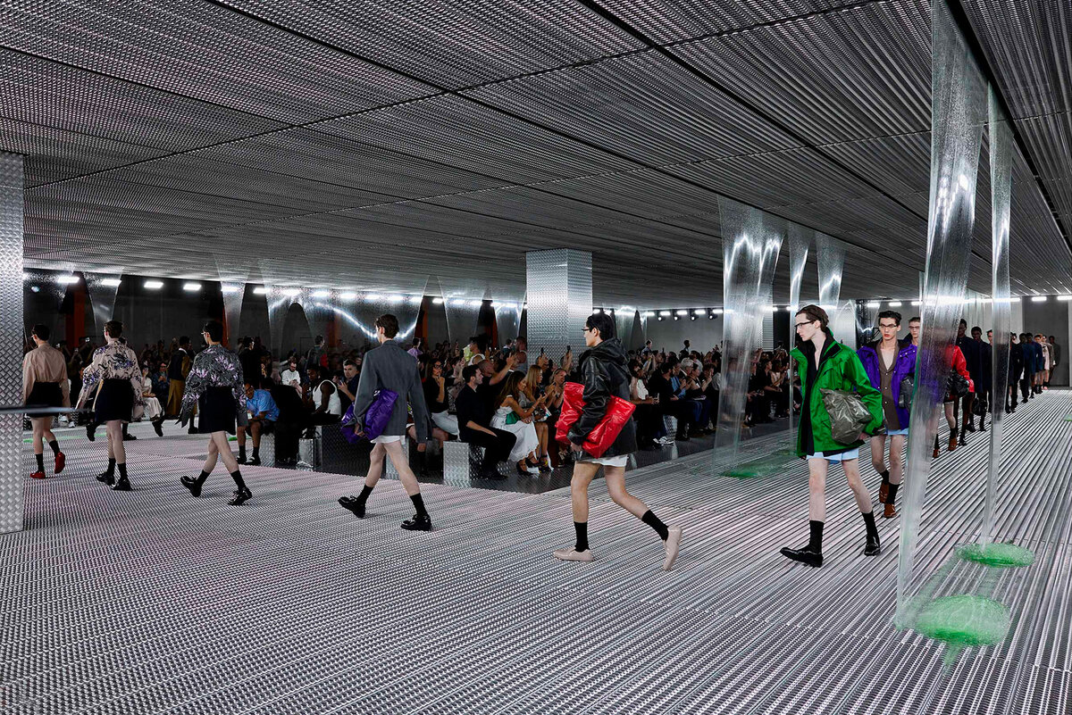 Песня Nine Inch Nails — Closer ещё даже не началась, когда эффектный момент освобождения на показе Prada заставил толпу громко охать и ахать от массового удовлетворения. Модель в белой рубашке с бахромой и чёрных школьных шортах прошёлся по подиуму из промышленной сетки. Внезапно с потолка начала сочиться слизь, которая падала по обе стороны от него. Она оседала в бледно-зелёную лужицу и медленно стекала. В своём липком состоянии она выглядела как нечто, оставленное Слаймером из «Охотников за привидениями», или пришельцем из «Чужого», а может и улиткой на ковре. После этого миссис Миучча Прада сказала: «Сейчас, в это время, мы должны снова привнести фантазию, идеи».