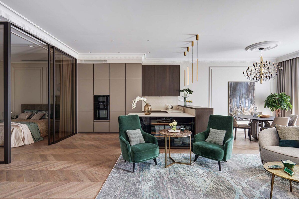 Представляем вашему вниманию отделку в неоклассическом стиле апартаментов в ЖК Балчуг Вьюпойнт общей площадью 122м2. Хозяева, респектабельная семейная пара, узнали о компании «ОлимпСтройСервис» по объектам ведомым нами в этом элитном ЖК. По достоинству оценив качество отделки осмотренной квартиры и портфолио работ в выбранном стиле, заказали проекты дизайна и инженерии, а по их готовности – ремонт с авторским надзором. Менее чем через год в июле 2021 квартира с наполнением мебелью и декором была полностью готова. Проектирование началось с обмера и проработки планировки помещения, статус апартаментов которого в сравнении с жилой недвижимостью предоставлял больше возможностей для изменения. Полученное от застройщика оборудование было учтено в проекте: конвектора отопления встроенные в пол, деревянные оконные рамы огромного размера, входная дверь с единой отделкой снаружи стеклянными панелями по всему этажу, а также приточная вентиляция и центральное кондиционирование. В итоге получилас