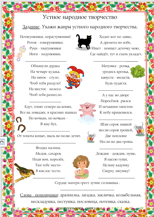 Устное народное творчество – это художественные произведения, созданные народом. Данное понятие заключает в себе значение явления: это произведения устного характера, которые создавались исключительно народом. Устное народное творчество сокращенно принято называть УНТ. Синонимом данного термина является термин «фольклор». Устное народное творчество, которое формируется с давних времен, не предусматривает авторства произведений, так как автором является целый народ. В этом заключается основное отличие между фольклором и авторским творчеством. Ниже представлены интерактивные рабочие листы для проверки знаний у учеников 2 класса. https://app.teachermade.com/begin/1f9d4d50-8637-4c30-a90a-3d6d7cfa0bf8 Конструкт урока и рабочий лист для печати.