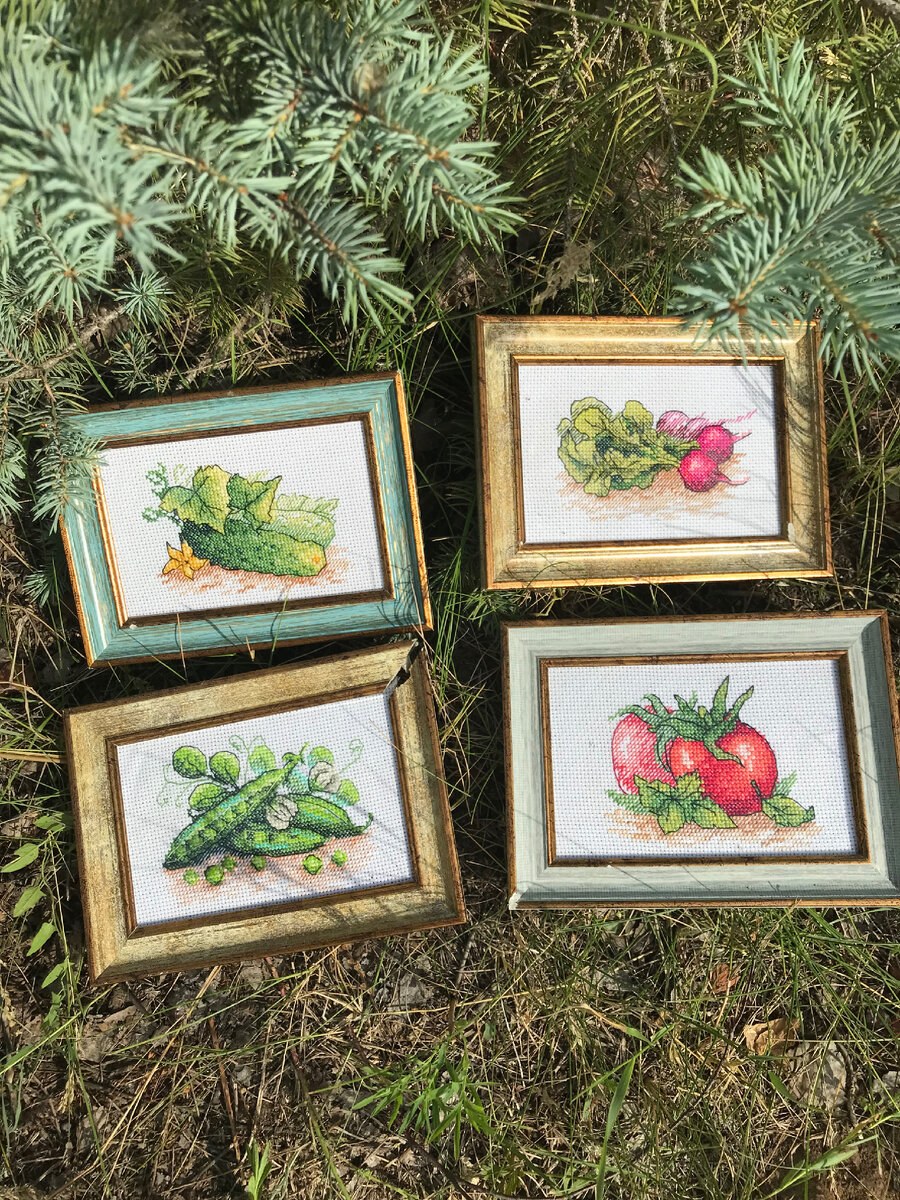 Живут все работы даче. Вышивалось для мотивации: сажать и растить огород))) В этой серии ещё был баклажан. Его не купила, понимала, что не осилю. К тому же, баклажаны почти не сажаю. Крайне редко.