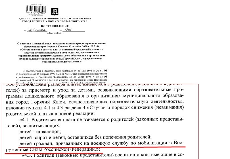 При этом на сайтах горячеключевских детсадов есть постановление, подписанное главой администрации города Сергеем Белопольским от 6 октября 2022-го года № 1842 «О внесении изменений в постановление администрации МО г. Горячий Ключ от 30 декабря 2020-го года № 2164 «Об установлении размера платы, взимаемой с родителей (законных представителей) за присмотр и уход за детьми». В нём можно прочесть, что плата не взимается с тех семей, в которых есть «призванные на военную службу по мобилизации в ВС РФ».