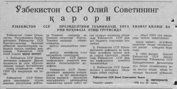 Узбекистан, Ташкент — АН Upl.uz. Согласно недавно появившейся вырезке из номера газеты «Совет Узбекистони» от 24 июня 1990 года, стало известно, что Ислам Каримов, вступивший в должность президента Узбекистана, получал ежемесячную зарплату в размере 1500 сумов в первые годы независимости страны.