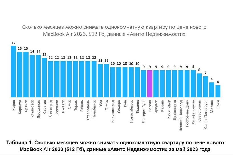 В России открыли предзаказ нового Apple MacBook Air 15». Версию с SSD-накопителем объёмом 512 ГБ оценили в «скромные» 189 990 рублей. Сервис «Авито Недвижимость» решил посчитать, сколько месяцев можно снимать квартиру в городах России на эту сумму. Средняя стоимость сдачи «однушки» в РФ составляет 20 тысяч рублей, поэтому бюджета на новый MacBook хватит на 9 полных месяцев найма, отмечают аналитики. Самый короткий срок аренды на эту сумму будет в Сочи — всего 4 месяца. Там квартира обойдётся в 45 тысяч рублей. Москва заняла только второе место — там цены MacBook Air хватит на 5 месяцев аренды. На третьем месте Санкт-Петербург — 7 месяцев. Омск оказался ближе к концу рейтинга. В нашем городе за цену нового гаджета можно прожить в съёмной квартире целый год (средняя аренда — 15,8 тысячи в месяц). Самая недорогая аренда в Кирове — стоимости MacBook Air хватит на 17 месяцев съёма жилья. Читайте также на портале Om1.ru В Омской области продают дом «для фоточек в соцсетях» за 33 миллиона р