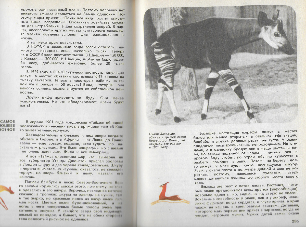 В детстве обожала "читать" картинки в альбомах про животных. Изрезав порядочное количество книг, я вклеивала вырезки в тетрадки под разными названиями. Так у меня появлялись собственноручно сделанные книги о животных. Когда выросла, то решила купить взамен искалеченной литературы новую. Так появилась вновь книга Игоря Ивановича Акимушкина "Мир животных". Приведу пример в виде сканов из главы о жирафах