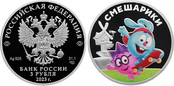 На новых памятных монетах изображены популярные персонажи — Крош и Ёжик. Банк России выпустил в обращение памятные монеты «Смешарики» серии «Российская (советская) мультипликация», сообщили в пресс-службе регулятора. Монеты представлены в трёх вариантах. 1. Серебряная монета «Смешарики» номиналом 3 ₽. Масса драгоценного металла в чистоте — 31,1 г, проба сплава — 925. Диаметр — 39 мм. Каталожный номер: 5111-0483. На лицевой стороне монеты расположены: рельефное изображение государственного герба России, надписи «Российская Федерация», «Банк России», номинал монеты «3 рубля», дата «2023 г.», обозначение металла по периодической системе элементов Д. И. Менделеева, проба сплава, товарный знак Санкт-Петербургского монетного двора и масса драгоценного металла в чистоте. На обратной стороне монеты расположены: выполненные в цвете изображения героев мультфильма «Смешарики» на фоне рельефного изображения домика одного из героев, вверху по окружности — рельефная надпись «Смешарики». С лицевой и