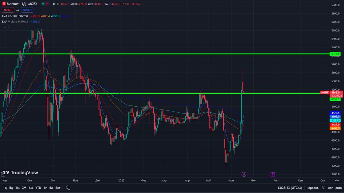 Сегодня, после роста на 17% за несколько дней, Магнит охлаждается, падает на 3,5%. Пошёл на ретест сопротивления, которое было пробито.