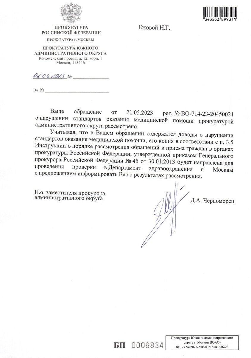 Прокуратура мою жалобу в итоге отписала в Департамент Здравоохранения г. Москвы. Который отдельно мне уже ответил.