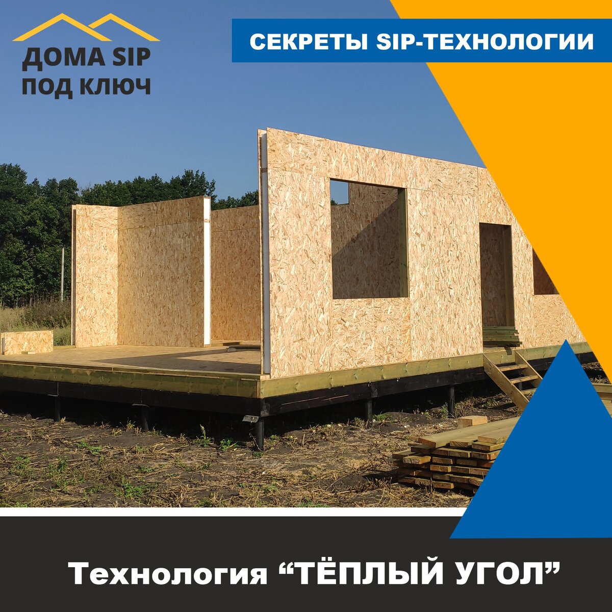 📌«Тёплый угол» - это способ стыковки СИП-панелей, который обеспечивает полную герметичность соединения и отсутствие тепловых потерь. Суть технологии состоит в том, что при выводе углов одна панель упирается во вторую, торец которой закрывает продолжающийся лист ОСП первой панели. Таким образом все стыки получаются тупиковыми – сама возможность возникновения мостиков холода, сквозняков исключается полностью. Кроме того, такой способ соединения усиливает жёсткость строения.