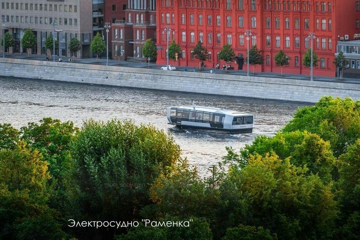 На маршруте длиной 6,5 км — 8 электросудов, назвали их в честь столичных рек: Синичка, Сетунь, Пресня, Филька, Сходня, Раменка, Яуза и Неглинка. Каждое вмещает до 50 пассажиров, есть места для маломобильных граждан.