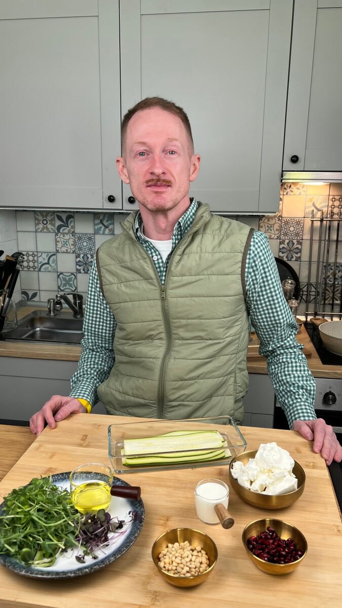 - Цукини порезать на 4 слайса толщиной 2-3 мм и обжарить в разогретом оливковом масле по 20-25 секунд с каждой стороны, не дольше.