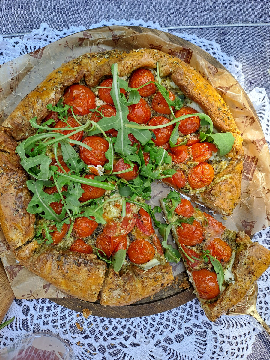 Вы должны это попробовать, просто феерия вкуса 🔥 Блюдо с итальянскими мотивами, готовится очень просто и быстро. Для теста нам понадобится: Для начинки: Первым делом беремся за тесто. Муку просеиваем, добавляем соль и разрыхлитель. Смешиваем воду с маслом и добавляем к муке. Вымешиваем тесто, оно должно быть эластичным и не прилипать к рукам. Тесто хорошо обмять, обернуть пищевой пленкой и убрать в холодильник на 15-20 минут. По прошествии время раскатать тесто в тонкий круг, можно сразу на пергаменте, или силиконовом коврике. Перенести на противень и приступить к сборке галеты. Не доходя до края см 5 первым слоем выгладываем рикотту, далее выгладываем песто. Помидорки черри режем на половинки и выкладываем сверху, посыпаем смесью прованских трав. Края галеты заворачиваем, так, чтобы центральная часть с начинкой осталась открытой. Смазываем желтком. Отправляем в разогретую до 180 градусов духову на 40-45 минут. Даем нашей галете немного остыть и приступаем к чаепитию