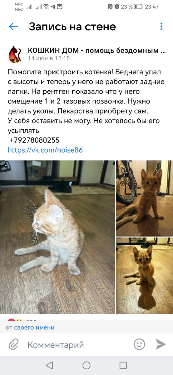 6146р.. 🙏🙏🙏 Такие мысли были первыми, когда появился пост про этого маленького солнышка. Рыженький, совсем ребёнок... Парню, который его взял и написал этот пост даже не сказали, что малыша надо сцеживать, иначе мочевой просто лопнет.. Как обычно много охов и ахов, но по передержке - тишина. Никому не нужен пожизненный инвалид.. Марина, наша мама котиков инвалидов не смогла спокойно смотреть в эти детские глаза.. На следующий день котенок был уже у неё. Конечно малыша никто не обследовал и они сразу отправились в клинику. И, о как редко это бывает, диагноз обрадовал и Марину, и рыжее солнышко Аркашеньку ♥️ Он НЕ СПИНАЛЬНИК! ОН БУДЕТ ХОДИТЬ! Сильнейший ушиб и отёк, из-за отека лапки висят тряпочкой 😢 Но это поправимо 🙏 Ко всему прочему у Аркаши чмт и трещина в небе. Это какой силы должен был быть удар.. Палка или нога.. Авто бы не оставило никаких шансов для такого малыша.. Сейчас Аркаше назначено лечение: 3х часовые капельницы, уколы, массаж и зарядка для лапок.. В первый де