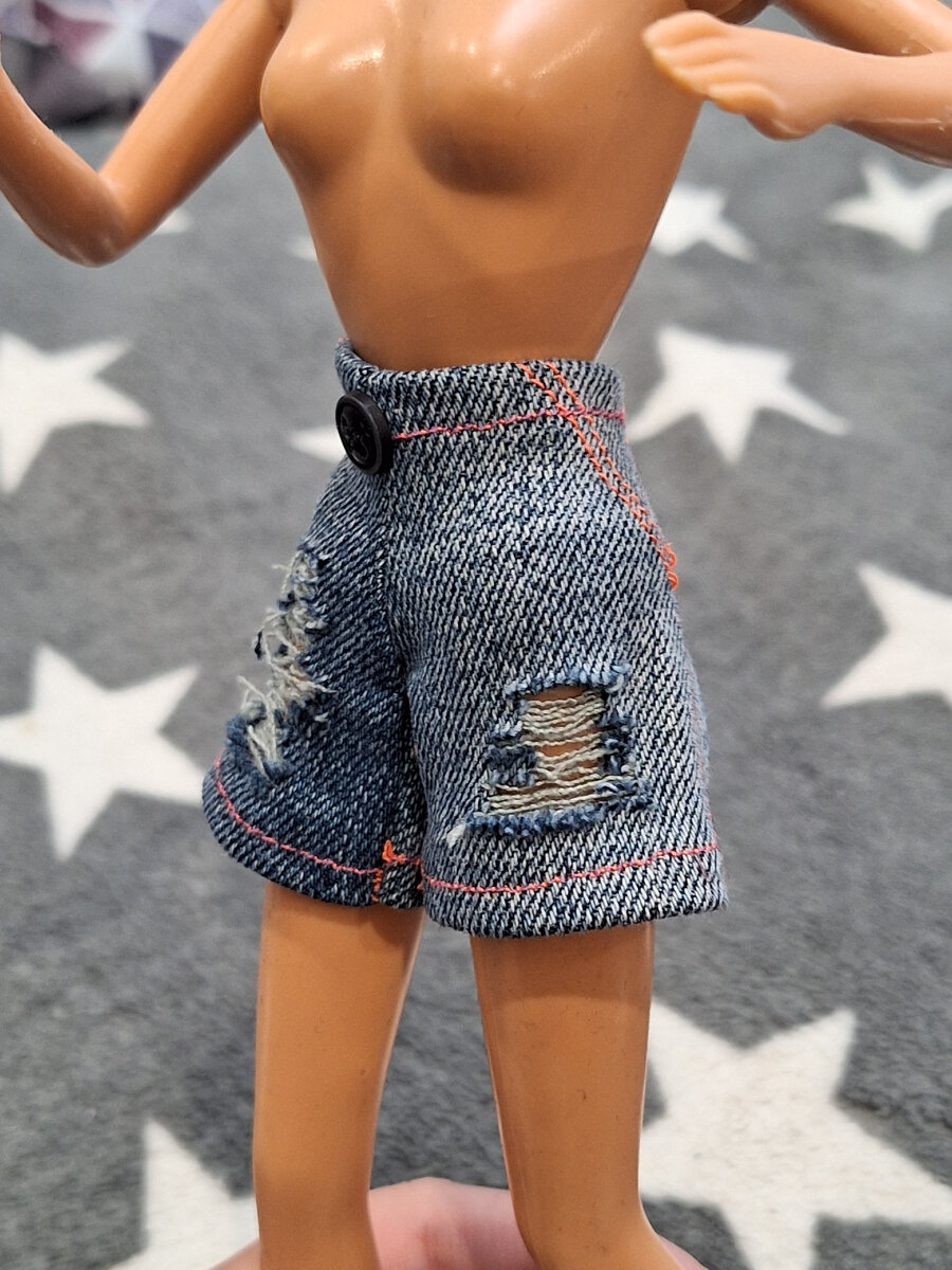 Всем Привет👋 Сегодня расскажу о своей первой пробе пошива вещи из натуральной джинсы. Итак, у меня была примерно такая выкройка для шорт (я сама её построила), но в интернете можно найти готовую и распечатать или срисовать по клеточкам. Выкраиваем две такие детали. Делаю декоративные строчки, напоминающие линию боковых швов и карманов. Затем прострачиваю нижний край внутрь (1). Соединяю штанины трубочкой и прошиваю (2), затем шов посередине (3) и в последнюю очередь пояс (4), собираю всё в "кучку", чтобы получилось вот так: Сзади шов не сшиваем, его просто обрабатываем и в дальнейшем сделаем застёжку. Пришиваем кнопку: И пуговичку спереди И вот как сидит готовая модель Смотрится очень даже стильно и молодёжно😉
