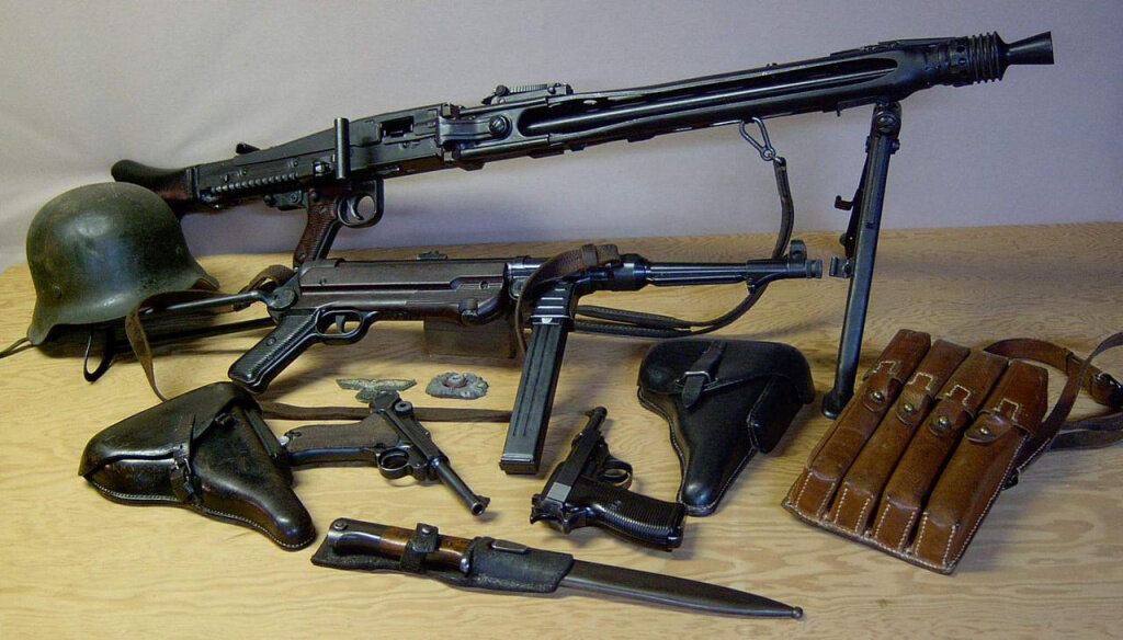 Самым распространенным немецким пистолетом-пулеметом войны был культовый 9-миллиметровый MP40. Эта модель была усовершенствованной версией предыдущего MP38. В то время как MP38 был создан на основе прессованной стальной трубы с канавками для уменьшения веса и повышения прочности оружия, в MP40 использовалась недорогая ствольная коробка из штампованной стали. Оба ПП очень похожи. MP38 можно узнать с первого взгляда по продольным канавкам на ствольной коробке и отверстию размером с монетку в нише магазина.