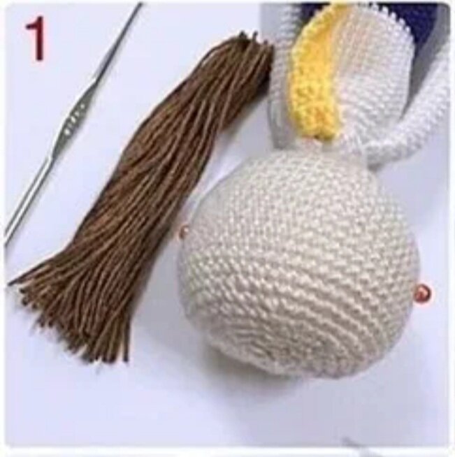Используем пряжу подходящего цвета. Толщина пряжи не должна быть слишком тонкой , иначе будет просвечивать пряжа которой вязали голову , меньше 400м.в 100 гр. я б не рееомендовала. Толстой пряжей , меньше чем в 100 гр.250 м.работать будет неудобно и волос в этом случае на голове будет слишком много. Нарезаем пряжу одинаковыми отрезками. Можно взять книгу , картон и намотать необходимое колличество витков. Разрезать по одному краю. Длину получившихся отрезков пряжи выбираем по желаемой причёске. Если сделать длинные , то в дальнейшем можно заплести косички или завязать хвостики. Намечаем контур где будут волосы. Отрезок пряжи складываем пополам будет петелька с одного края.Крючок вводим снизу вверх по голове за один столбик одного ряда , подхватываем петельку на нитке , протягиваем через столбик и в эту петлю протягиваеи второй конец нити сложенной вдвое и закрепляем. Так проходим по голове куклы. Можно цеплять каждый столбик , можно через столбик. А также каждый ряд или через ряд.Это