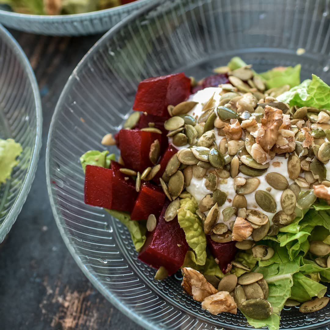 Вкусный салат из запеченной свеклы, рикотты, орехов с оливковым маслом на травах⠀