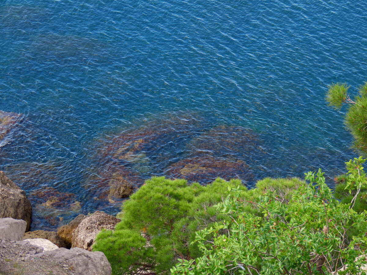 Начало прогулки здесь - На Караул-Оба через Веселовскую бухту. Еще немного и мы уже внизу. Нельзя сказать в общепринятом смысле, что мы на пляже! Но нам так нравится! Как же сегодня красиво не только море, но и небо! Белые облачка не только его украшают, но и дают надежду на тенёк! Идем искать свой камень, который и будет нашим пляжем. Пока отвлеклась на очередную окаменелость, Миша прошел дальше, и я не заметила, по каким камням он перепрыгивал. На мой вопрос – как? Я получила ответ – ты тропу не видишь? Конечно, вижу! Море вблизи совсем даже и не синее! А прозрачное и бирюзовое! От него невозможно оторвать взгляд! Но камешек нам не понравился, и мы прошли еще немного дальше. Наконец-то все найдено! И камень, и спуск в море. Можно расслабиться и нырнуть в эти хрустальные воды! А сзади! Тот самый огромный камень нависает над головой! И «живые» склоны! Только сосны корнями держат эту гору! А эта глыба держится уже только на честном слове! Сколько, интересно это "слово" еще выдержит